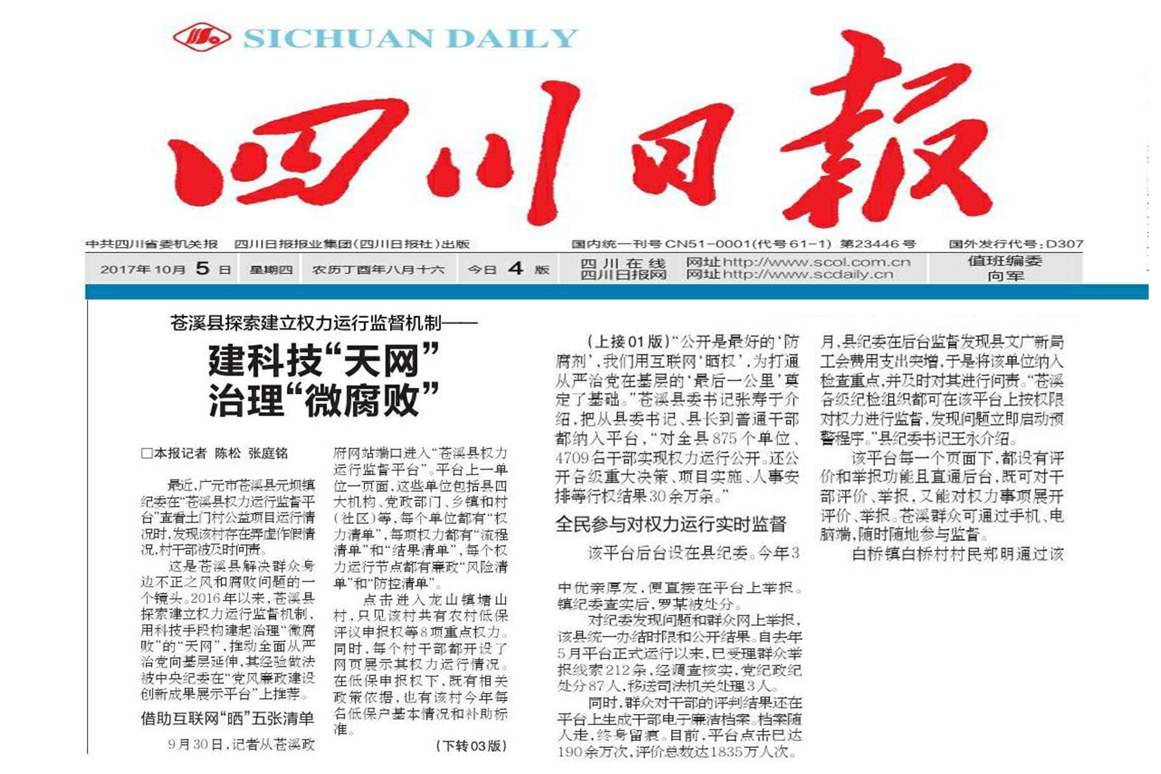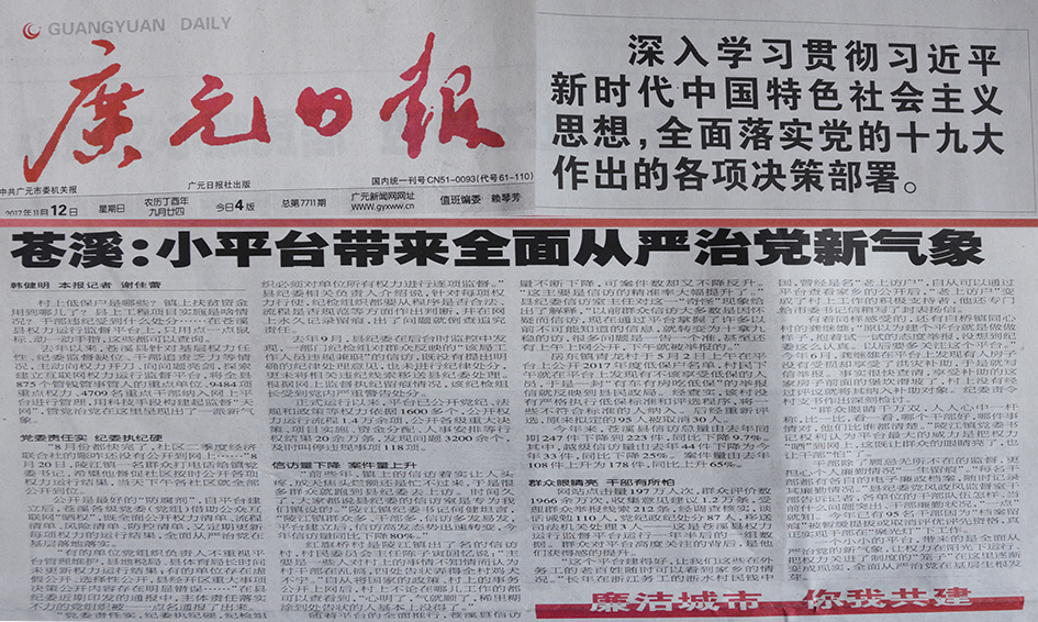 摘要:11月12日,《广元日报》头版刊文报道:苍溪县小平台带来全面从严治党新气象。 村上低保户是哪些?镇上扶贫资金用到哪儿了?县上工程项目实施是啥情况?干部违纪受到什么处分……在苍溪县权力运行监督平台上,只用点一点鼠标、动一动手指,这些都可以查询。 去年以来,苍溪县针对基层权力任性、纪委监督缺位、干部追责乏力等情况,主动向权力开刀、向问题亮剑,探索建立互联网权力运行监督平台,将全县875个管钱管事管人的重点单位、9484项重点权力、4709名重点干部纳入网上平台进行管理,用科技手段构建起监督“天网”,管党治党在这里呈现出了一派新气象。 党委责任实纪委执纪硬 “8月份都快完了,社区二季度经济联合社的账咋还没有公开到网上……”8月20日,陵江镇一名群众打电话给镇党委书记,希望他督促社区按时公开各项权力运行结果,当天下午各社区就全部公开到位。 公开是最好的“防腐剂”,自平台建立后,苍溪各级党委(党组)借助公众互联网“晒权”,既全面公开权力清单、流程清单、风险清单、防控清单,又定期更新每项权力的运行结果,全面从严治党在基层落地落实。 “有的单位党组织负责人不重视平台管理维护,县地税局、县体育局长时间未更新权力运行结果;有的单位存在虚假公开、选择性公开,县经开区重大事项决策公开内容存在明显错误……”在县纪委近期印发的通报中,主体责任落实不力的党组织被一一点名通报了出来。 “党委责任实,纪委执纪硬,纪检组织必须对单位所有权力进行逐项监督。”县纪委相关负责人介绍说,针对每项权力行使,纪检组织都要从程序是否合法、流程是否规范等方面作出判断,并在网上永久记录留痕,出了问题就倒查追究责任。 去年9月,县纪委在后台时监控中发现,一部门纪检组对群众反映的“该局工作人员违规兼职”的信访,既没有提出明确的纪律处理意见,也未进行纪律处分,更未将相关违纪线索移送县纪委处理。根据网上监督执纪留痕情况,该纪检组长受到党内严重警告处分。 正式运行以来,平台已公开党纪、法规和政策等权力依据1600多个,公开权力运行流程1.4万余项,公开各级重大决策、项目实施、资金分配、人事安排等行权结果20余万条,发现问题3200余个,及时叫停违规事项118项。 信访量下降案件量上升 “前些年,镇上的信访着实让人头疼,成天焦头烂额还是忙不过来,于是很多群众就跑到县纪委去上访。时间久了,大家都说县纪委的信访室是专为我们镇设的。”陵江镇纪委书记何健坦言,“陵江镇群众多、干部多,信访多发易发,平台建立后,信访高发态势迅速转变,今年信访量同比下降80%。” 红旗桥村是陵江镇出了名的信访村,村民委员会主任陈子寅回忆说:“主要是一些人对村上的事情不知情而认为村干部在乱搞,四处告状弄得全村鸡犬不宁。”自从将国家的政策、村上的事务公开上网后,村上不论在哪儿工作的都可以查看到,“心明了,气就顺了,稀里糊涂到处告状的人基本上没得了。” 随着平台的全面推行,苍溪县信访量不断下降,可案件数却又不降反升。“这主要是信访的精准率大幅提升了。”县纪委信访室主任对这一“奇怪”现象给出了解释,“以前群众信访大多数是因怀疑而信访,现在通过平台掌握了许多以前不可能知道的信息,就转变为十拿九稳的访,很多问题是一告一个准,甚至还有上午上网公开,下午就被举报的。” 岳东镇青龙村于5月2日上午在平台上公开2017年度低保户名单,村民下午就在平台上发现有不该享受低保的人员,于是一封“有车有房吃低保”的举报信就反映到县民政局。经查实,该村没有严格执行低保标准和评选程序,将一些不符合标准的人纳入。后经重新评选,原来拟定的95人被取消30人。 今年来,苍溪县信访总量由去年同期247件下降到223件,同比下降9.7%。其中,越级信访量由去年44件下降为今年33件,同比下降25%。案件量由去年108件上升为178件,同比上升65%。 群众眼睛亮干部有所怕 网站点击量197万人次,群众评价数1966余万次,收集意见建议1.2万条,受理群众举报线索212条,经调查核实,谈话诫勉110人,党纪政纪处分87人,移送司法机关处理3人——这是苍溪县权力运行监督平台运行一年半后的一组数据。群众对平台高度关注的背后,是他们获得感的提升。 “这个平台建得好,让我们这些在外务工的老百姓随时可以看到家乡的情况。”长年在浙江务工的浙水村民钱中国,曾经是名“老上访户”,自从可以通过平台查看家乡的公开后,“老上访户”变成了村上工作的积极支持者,他还专门给市委书记信箱写了封表扬信。 有着同样感受的,还有白桥镇同心村的龚继雄:“原以为建个平台就是做做样子,抱着试一试的态度举报,没想到纪委这么认真。以后要多关注这个平台。”今年6月,龚继雄在平台上发现有人房子没有受损却享受了洪灾补助,于是就写信举报。事实很快查清,享受补助的这家房子前面的堡坎滑坡了,村上没有经过评议就将其纳入补助对象。纪委责令村支书作出深刻检讨。 “群众眼睛千万双,人人心中一杆称,比一比,看一看,哪个干部好,哪件事情对,他们比谁都清楚。”陵江镇党委书记权利认为平台最大的威力是把权力“晒”到网上,这既让群众的眼睛亮了,也让干部“怕”了。 干部除了顾忌无所不在的监督,更担心个人廉勤情况“一生留痕”。“每名