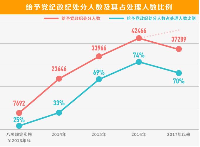 处理人数6190人、查处问题4353起……2017年11月20日,中央纪委监察部网站第49次发布全国查处违反中央八项规定精神问题月报数据,释放了决不能让“四风”问题卷土重来的强烈信号。据统计,八项规定实施五年来,各级纪检监察机关共查处违反中央八项规定精神问题19.3万起,处理党员干部26.3万人,其中给予党纪政纪处分14.5万余人。 五年来执纪力度持续加大,处分人数持续上升 数据显示,2012年12月八项规定实施至2013年底,给予党纪政纪处分0.76万余人,占处理人数的25%;2014年给予党纪政纪处分2.3万余人,占处理人数的33%;2015年给予党纪政纪处分约3.4万人,占处理人数的68%;2016年给予党纪政纪处分4.2万余人,占处理人数的73%;2017年前10个月给予党纪政纪处分3.7万余人,超过去年同期数量,占处理人数的70%。