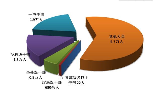 2017年,全国纪检监察机关共接受信访举报273.3万件次,处置问题线索125.1万件,谈话函询28.4万件次,立案52.7万件,处分52.7万人(其中党纪处分44.3万人)。处分省部级及以上干部58人,厅局级干部3300余人,县处级干部2.1万人,乡科级干部7.8万人,一般干部9.7万人,农村、企业等其他人员32.7万人。图1:全国纪检监察机关处分人员按职级划分图
